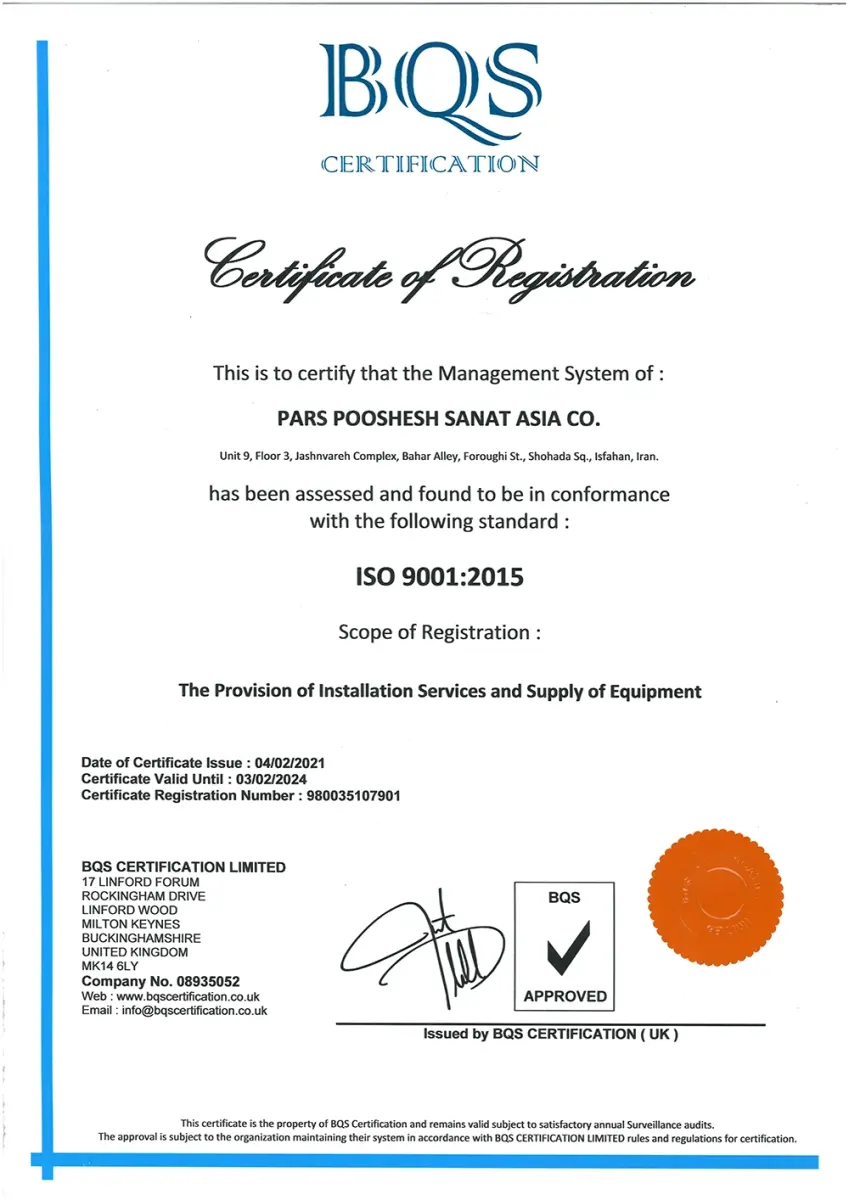 - دارای گواهینامه استاندارد مدیریت کیفیت درصنایع نفت، گاز و پتروشیمی ISO/TS29001