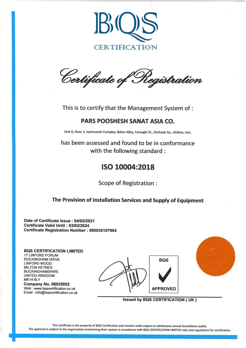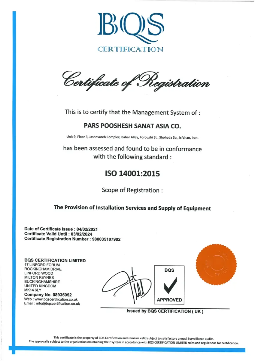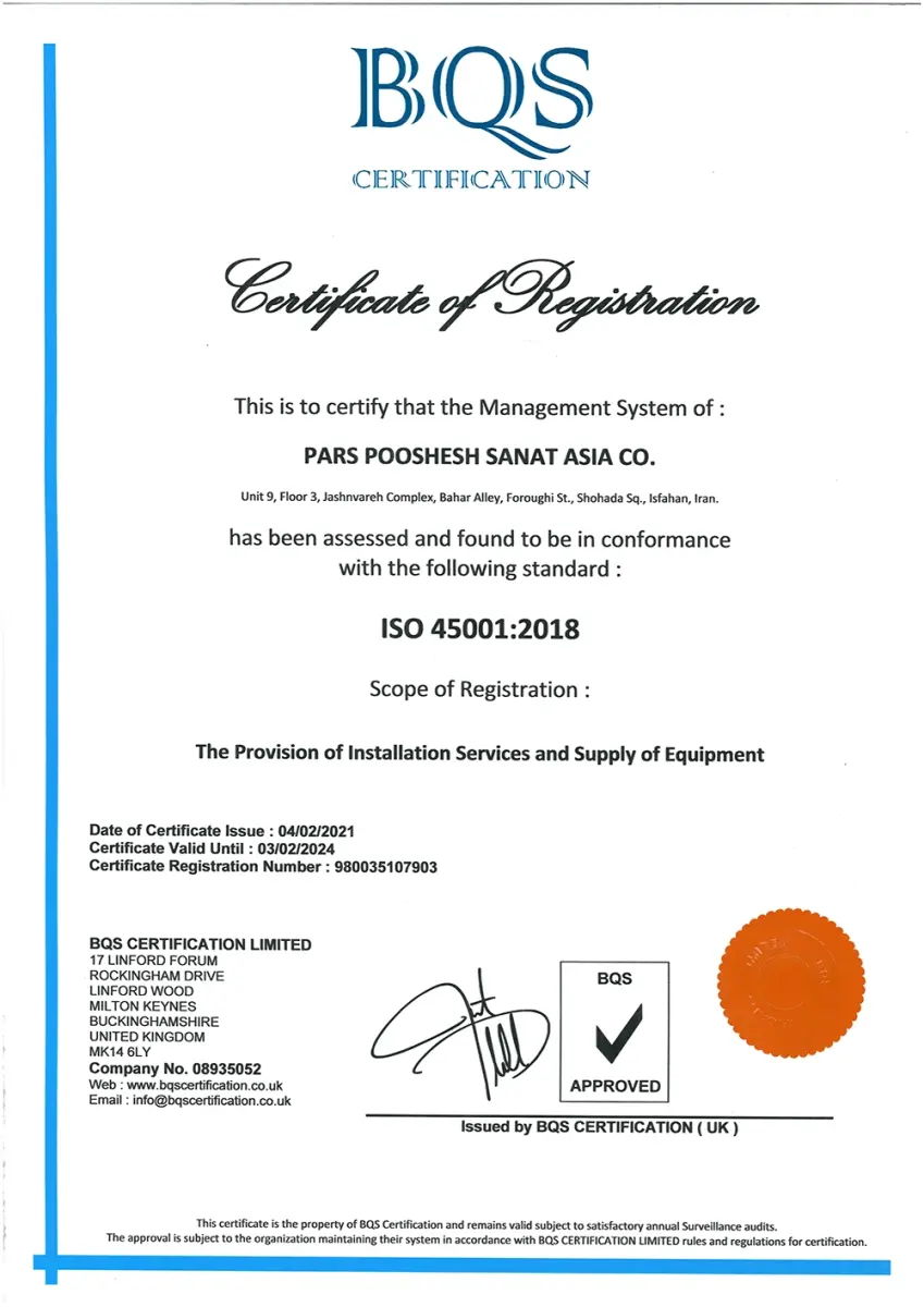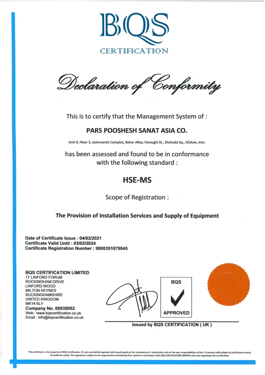 - دارای گواهینامه استاندارد سیستم مدیریت ایمنی و بهداشت شغلی HSE